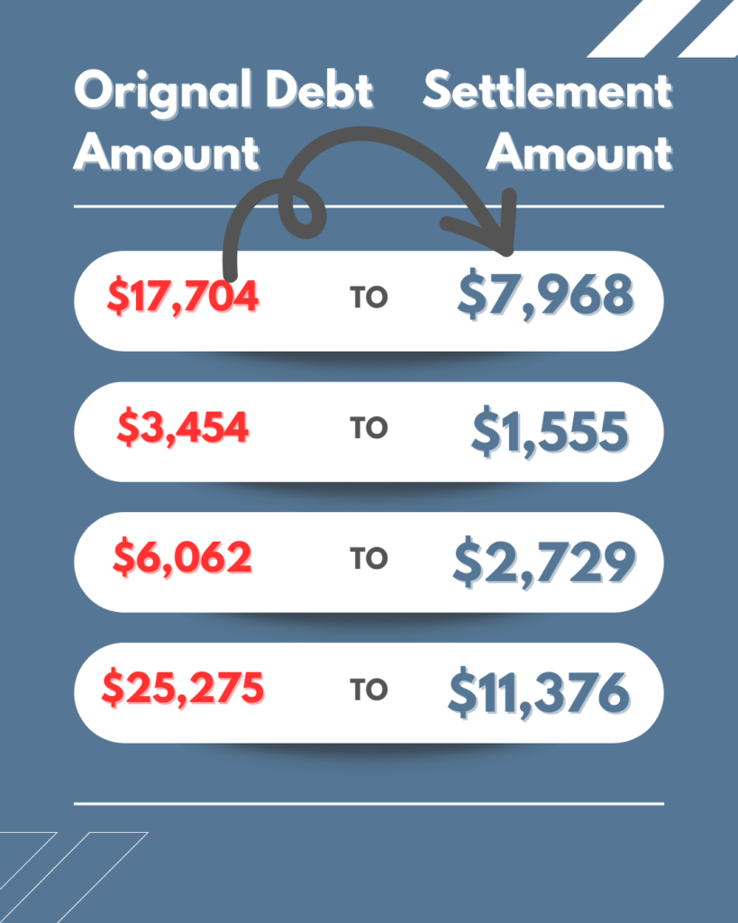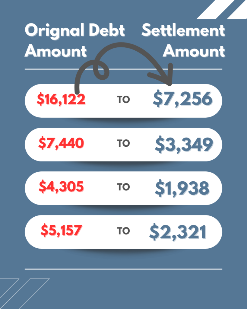Explore the promising opportunities for substantial savings that await you through our dedicated debt resolution representation . At the heart of our tailored solutions lies the commitment to presenting illustrative examples of successful outcomes. Our clients, through engaging with our services, have consistently experienced noteworthy reductions in their debt burdens. This achievement is a result of our meticulous approach to negotiation and the implementation of strategic settlement plans. These real-world success stories underscore the effectiveness of our programs in providing financial relief and a pathway towards greater fiscal well-being. We invite you to embark on a journey with us, where careful consideration and strategic planning can lead to tangible and meaningful reductions in your overall debt